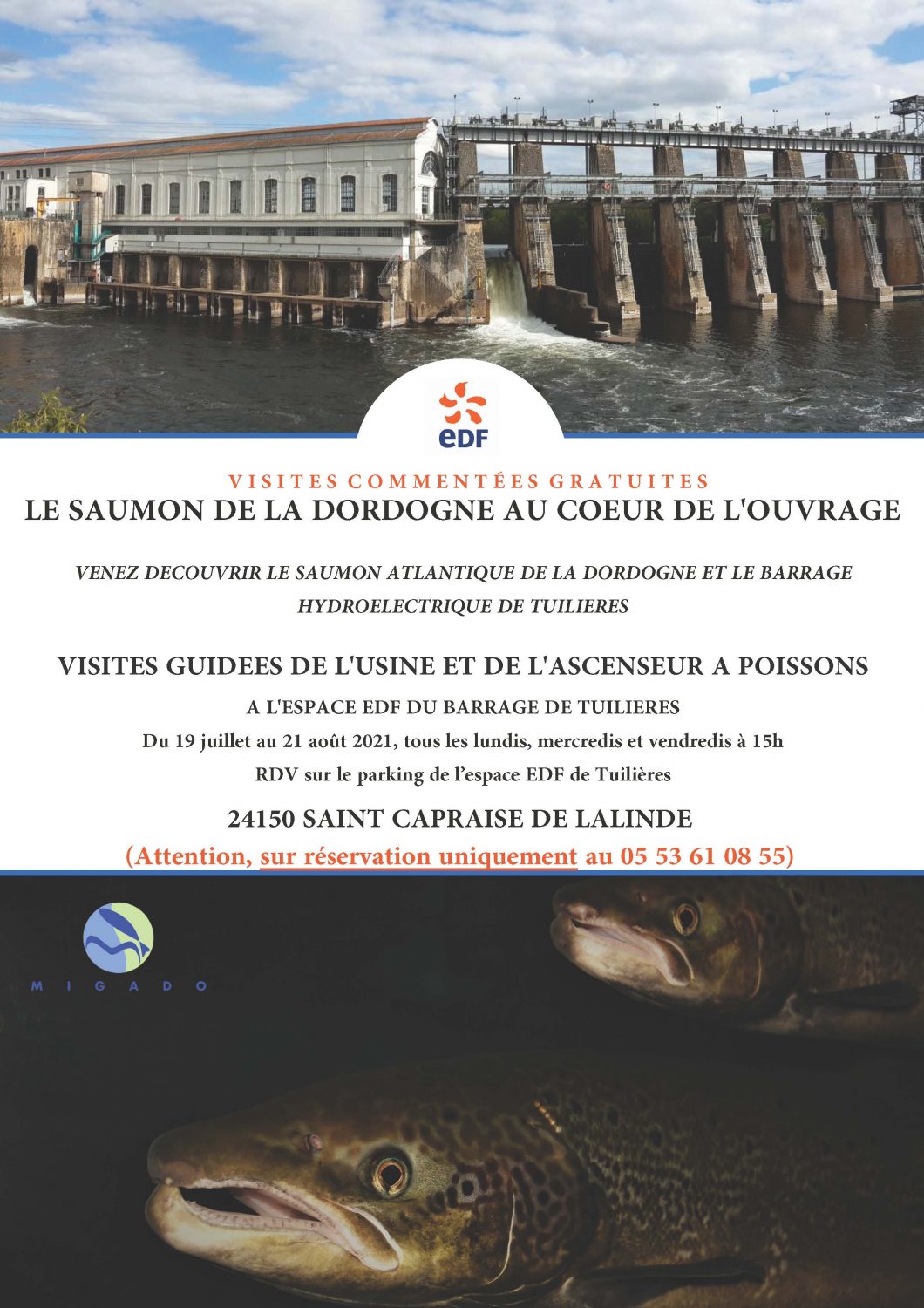 Venez découvrir cet été le saumon atlantique de la Dordogne et le barrage hydroélectrique de Tuilières jusqu’au 21 août. Vous découvrirez un dispositif d’ascenseur à poissons qui permet la libre circulation des espèces vers l’amont. MIGADO assure l’accueil du public en visite libre et des visites guidées les lundis, mercredis et vendredis sur réservation uniquement au 05 53 61 08 55 !