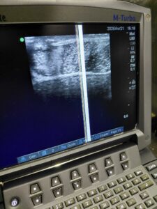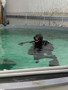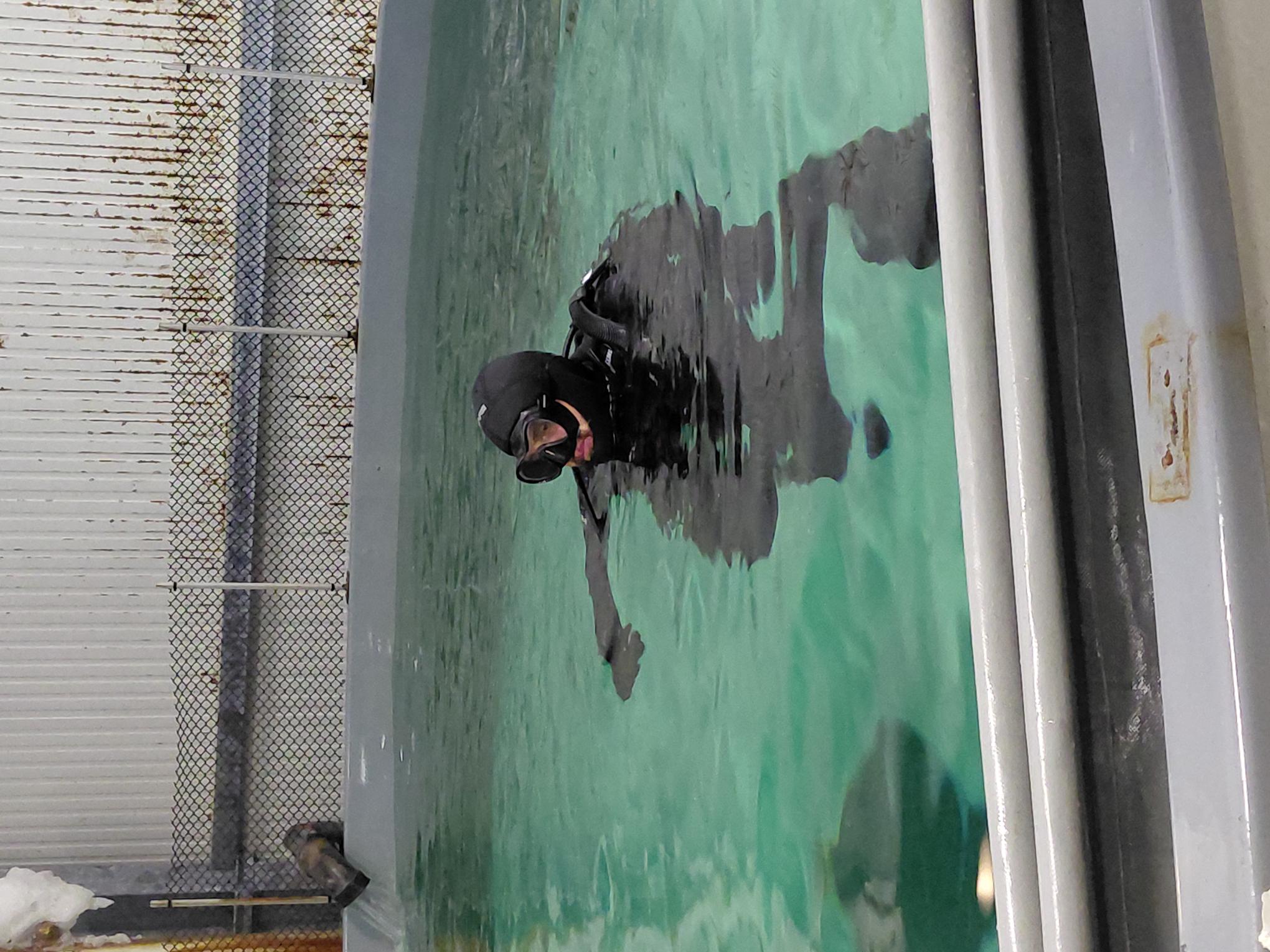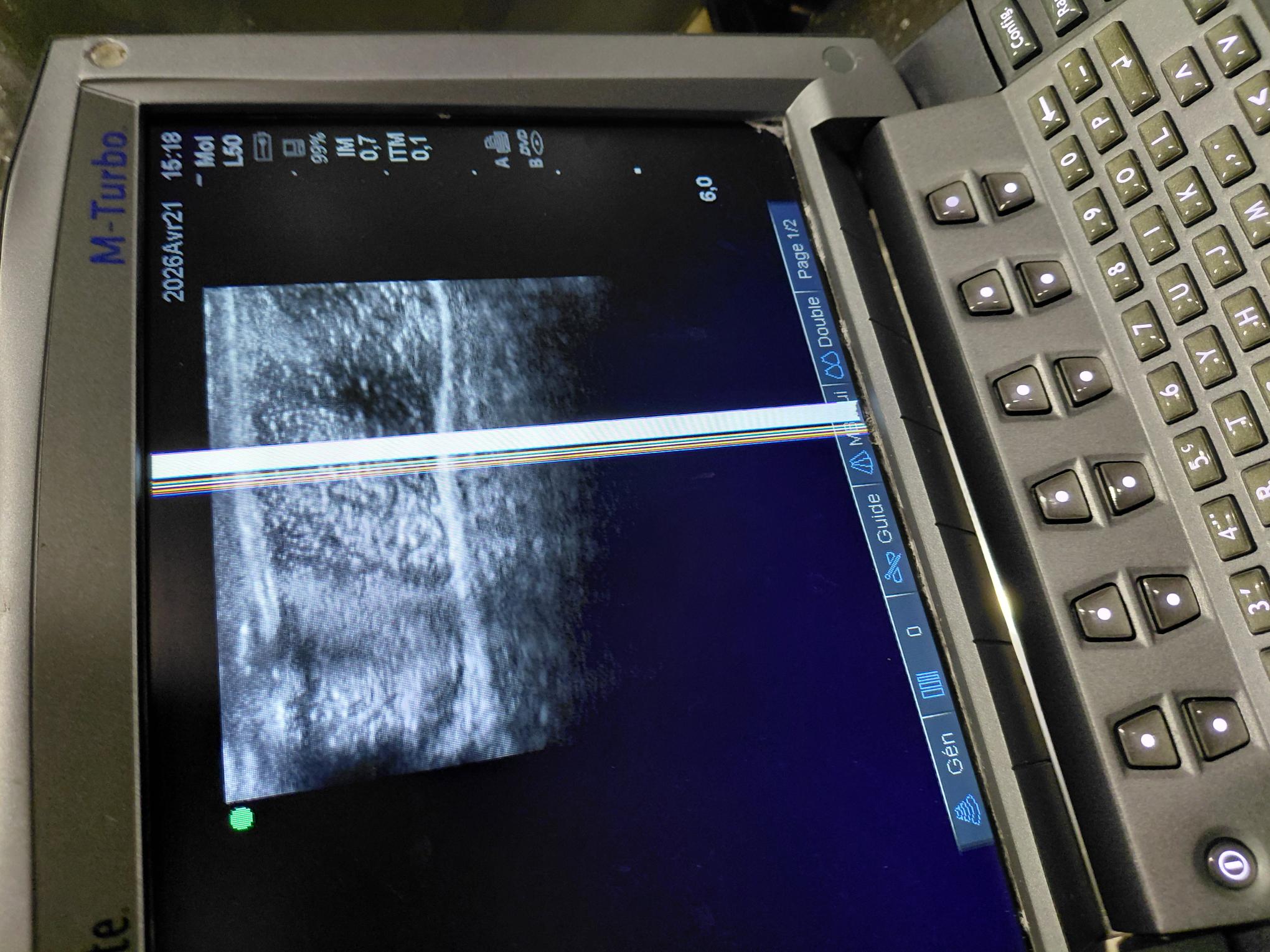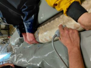 Une fois récupérés dans le bassin par un plongeur professionnel, des échographies sont réalisées sur l’ensemble des esturgeons européens présents dans le centre de conservation.
